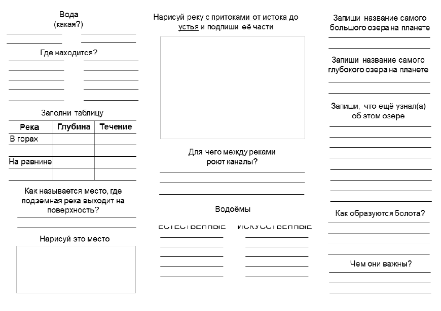 Рабочий лист для урока окружающего мира по теме "Водоёмы". Печать листа с двух сторон, складывается в виде буклета.