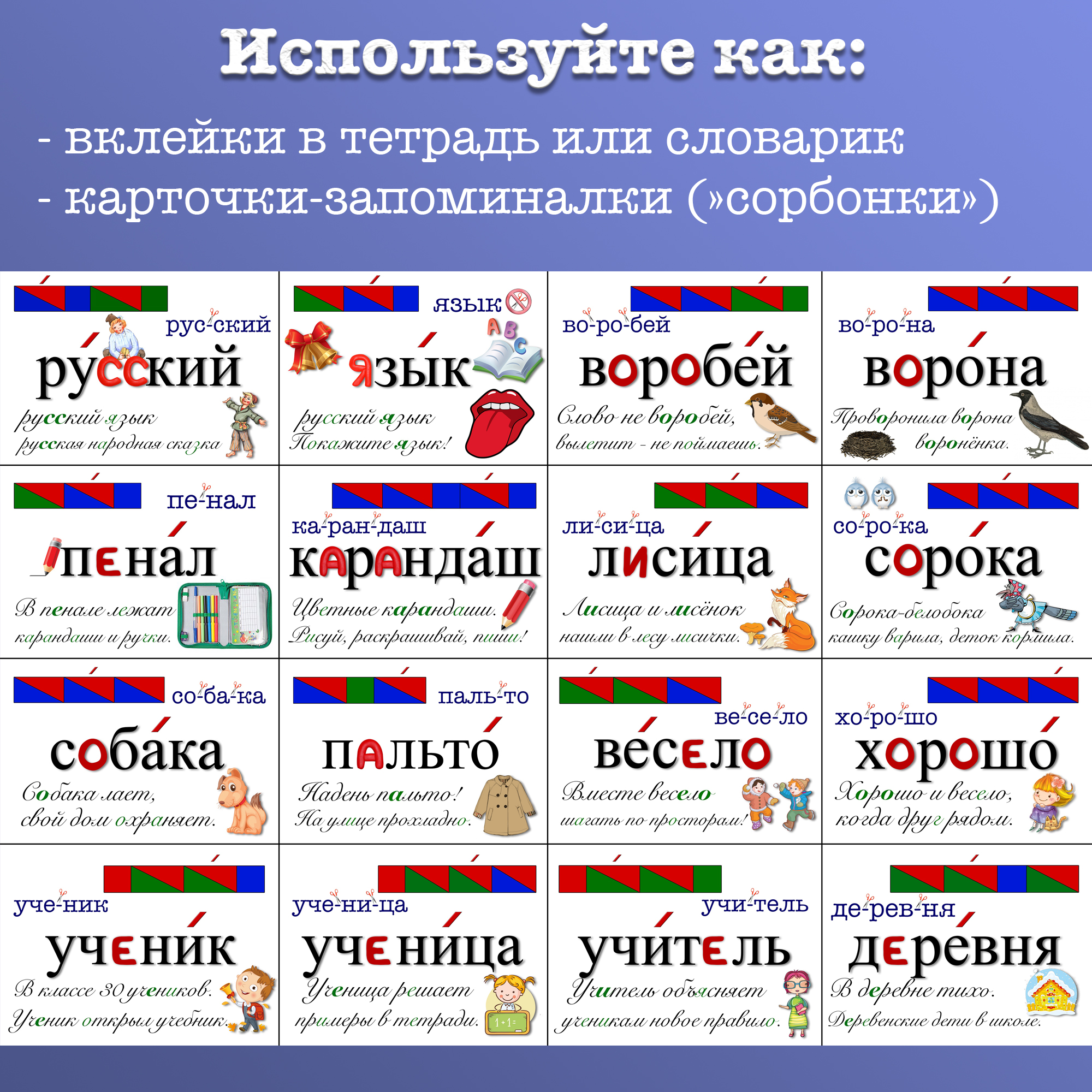 Набор карточек-вклеек и сорбонок по словарным словам для 1 класса