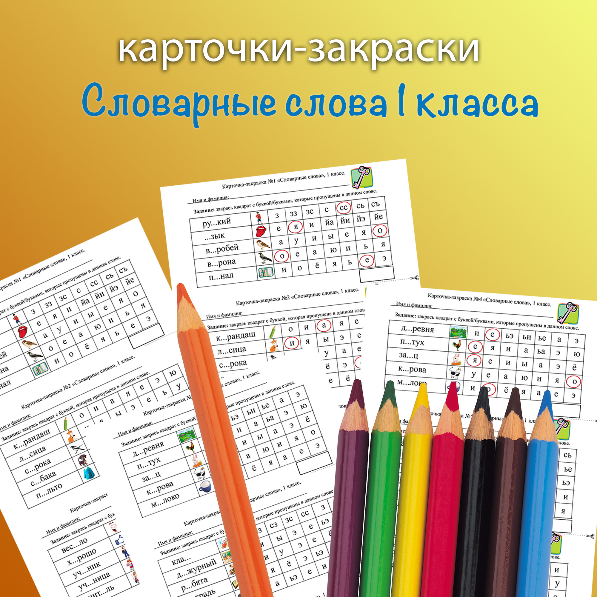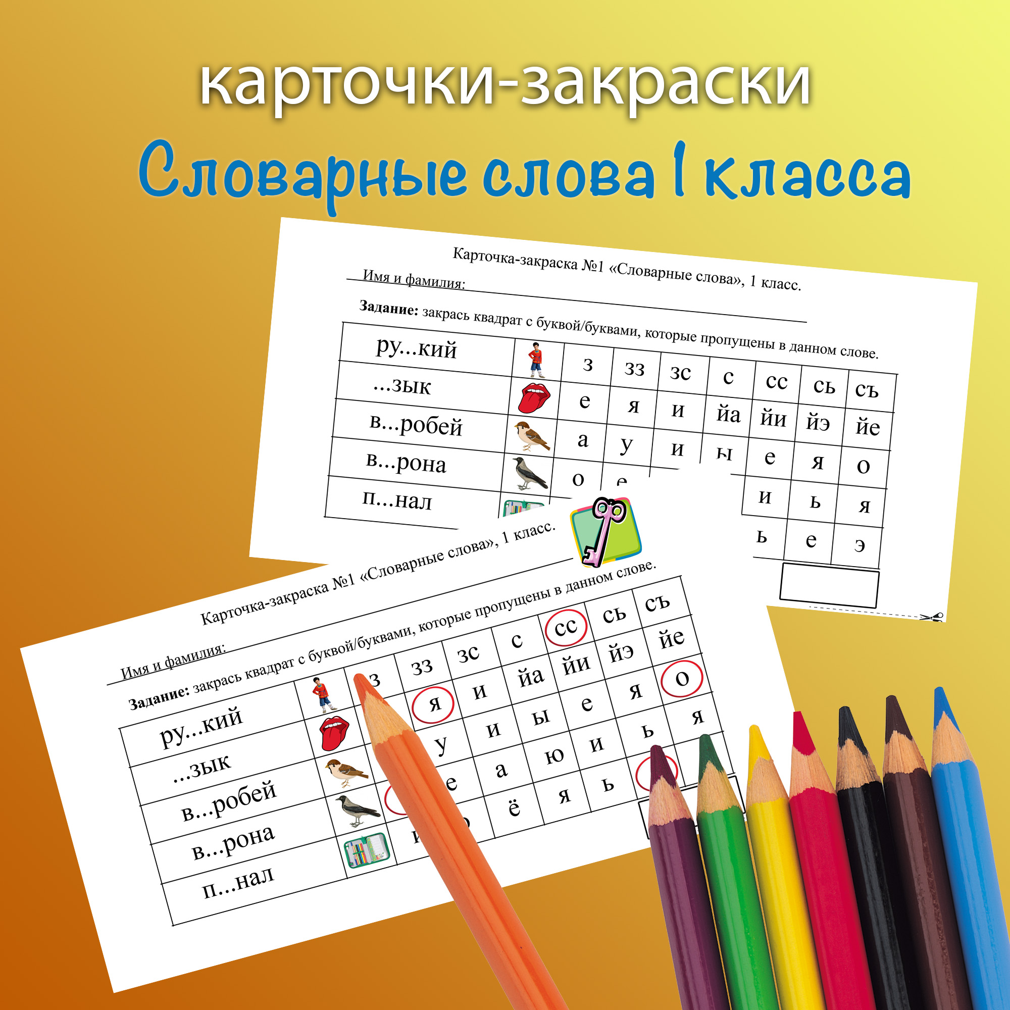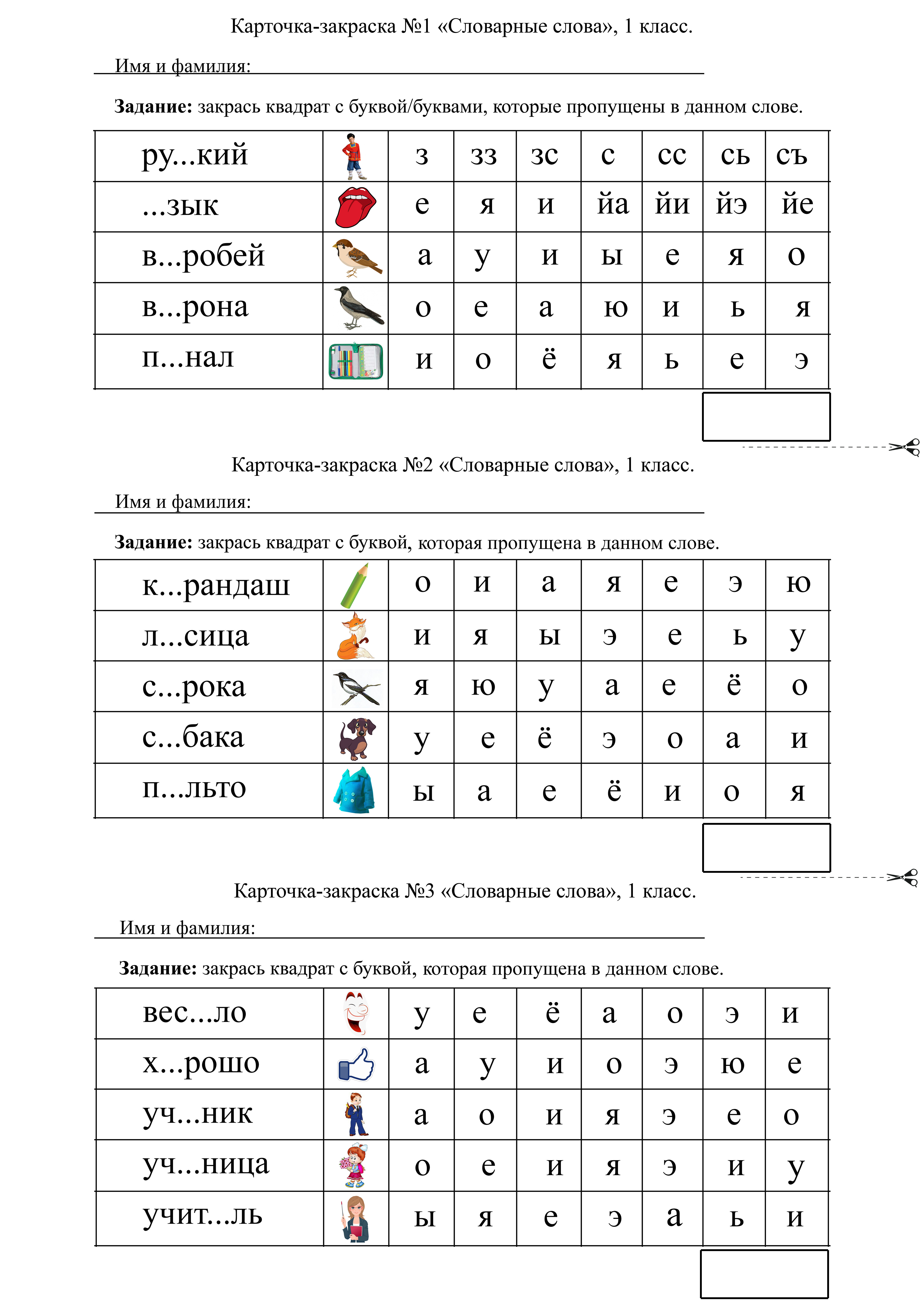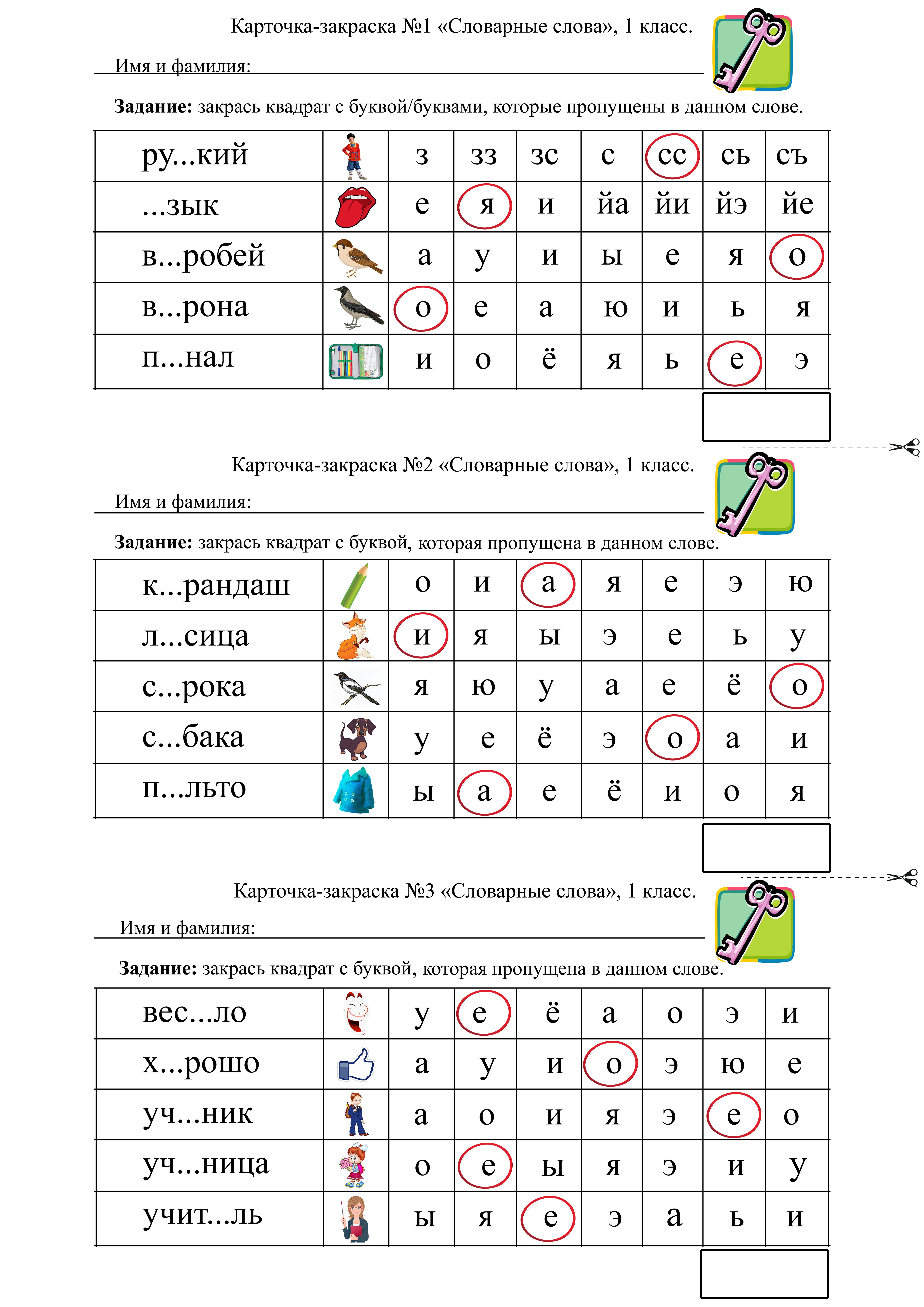 Набор карточек-закрасок по словарным словам для 1 класса