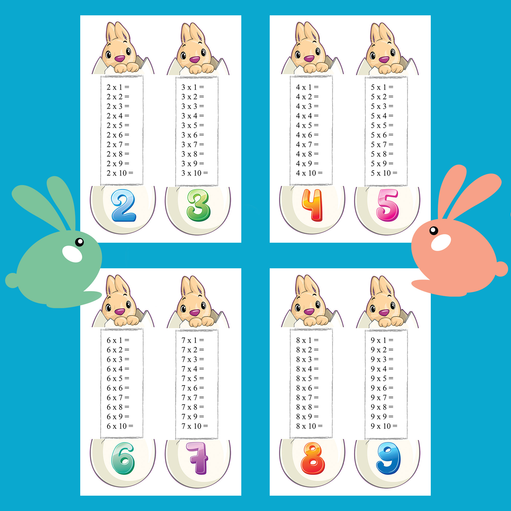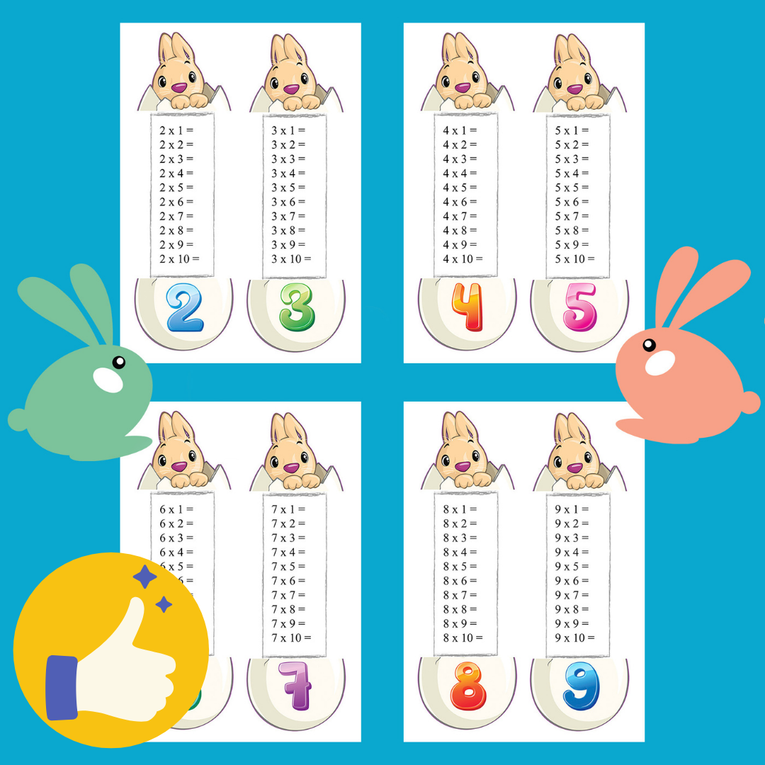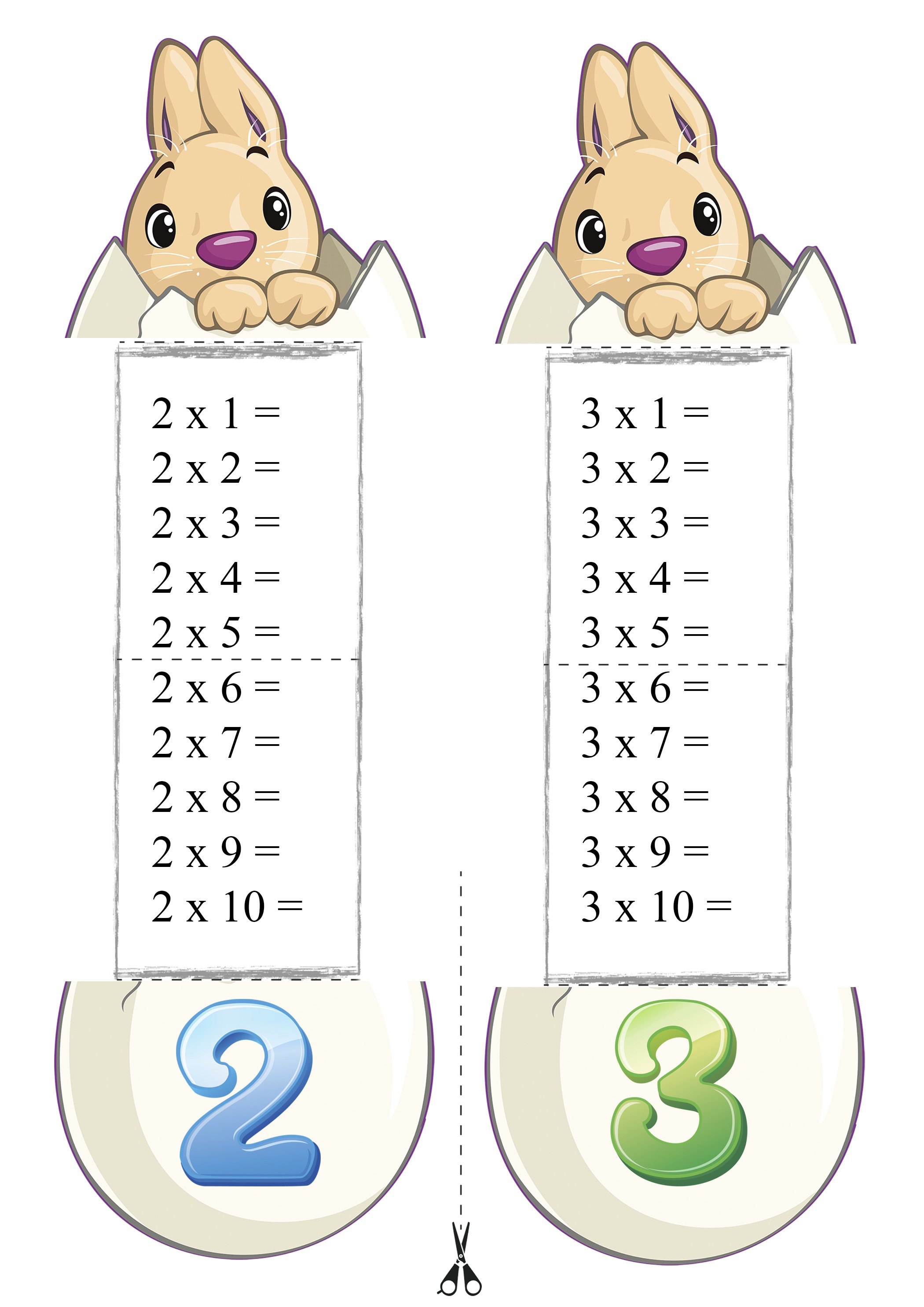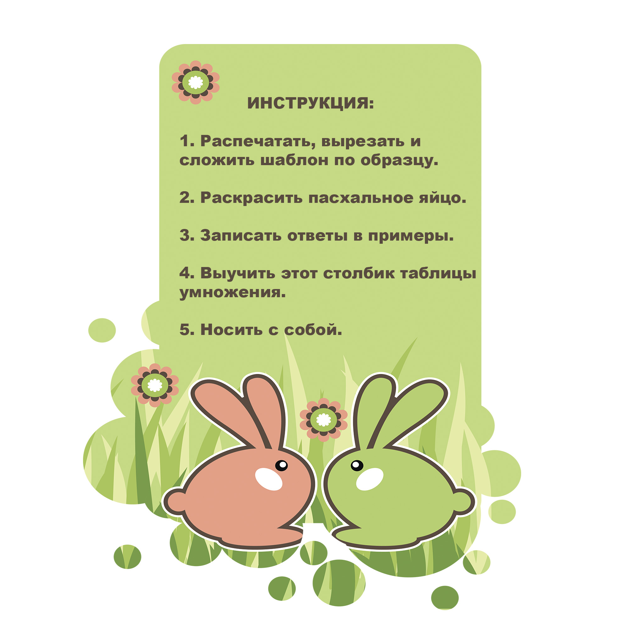 8 заготовок по всей таблице умножения (2-9). Распечатайте шаблоны, сложите их по инструкции. Если Вы используете чёрно-белую печать, то зайчат и яйца можно раскрасить. Этот набор - прекрасный способ запомнить табличные случаи умножения, потренироваться в решении примеров и сделать себе шпаргалку-помощницу. Ведь изготовление шпаргалок - отличный способ механического запоминания материала. Ярко, весело, полезно! Заготовку можно вклеить в тетрадь или использовать как закладку.