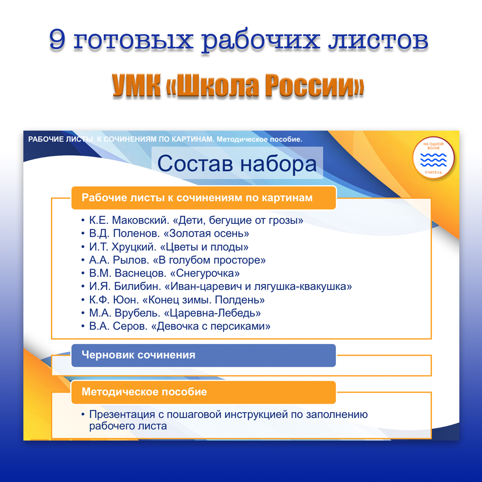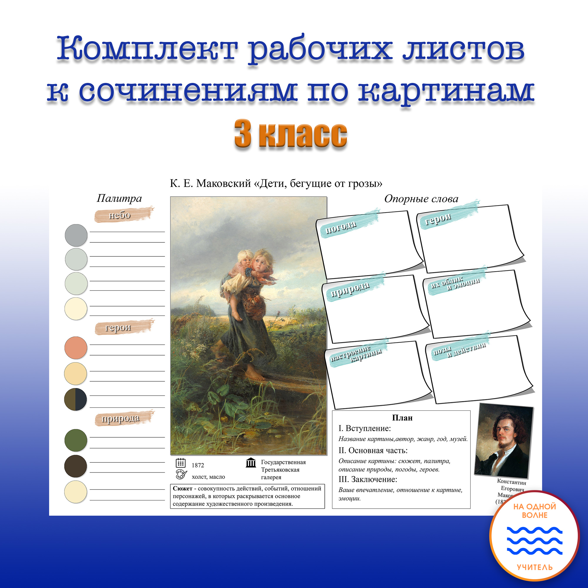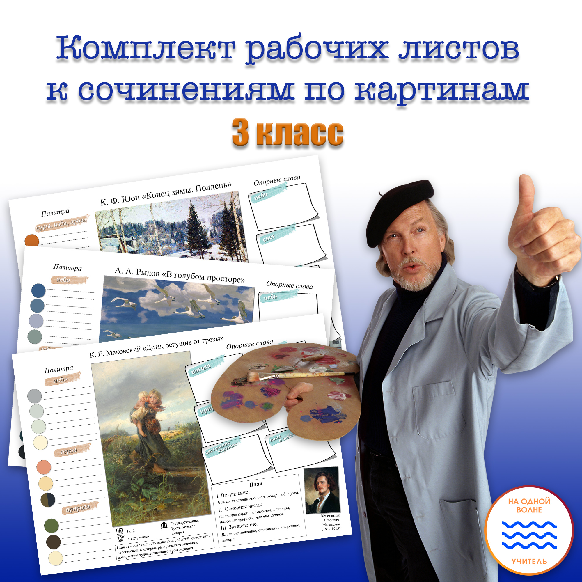 Состав комплекта: 9 готовых рабочих листов по картинам, 9 портретов художников, 9 репродукций, авторское методическое пособие (pdf). Все репродукции по программе УМК "Школа России" (3 класс). Шаблон черновика сочинения. Методичка с интерактивной пошаговой инструкцией по знакомству со структурой рабочего листа и его заполнению.