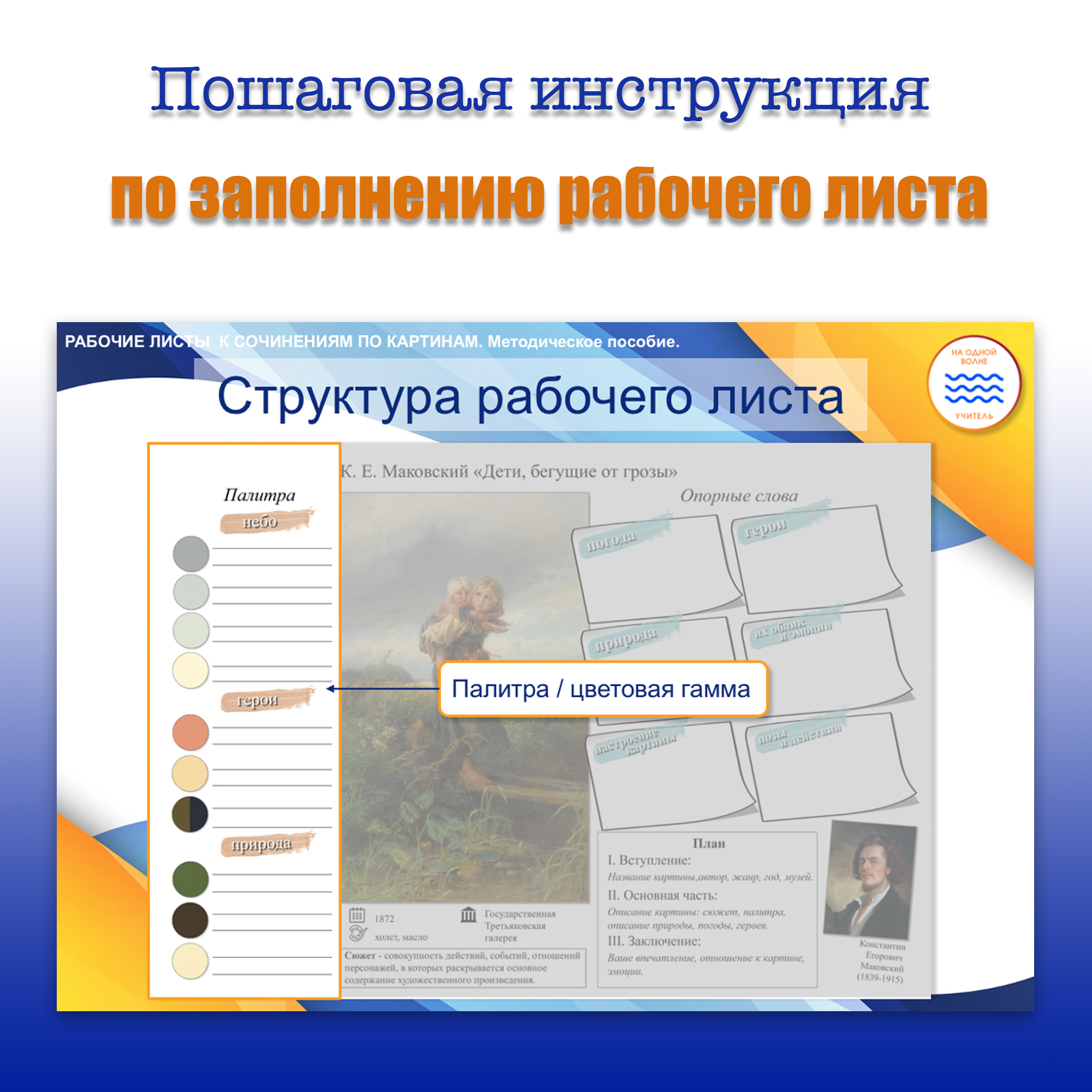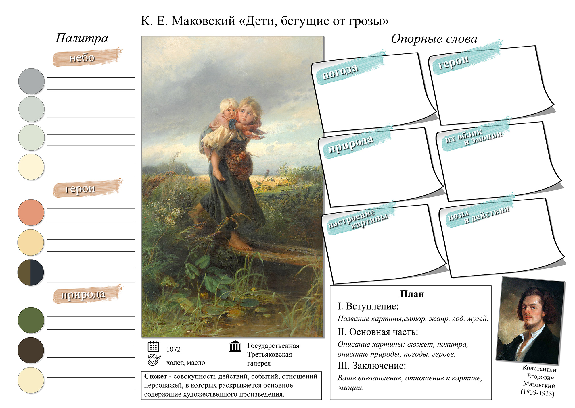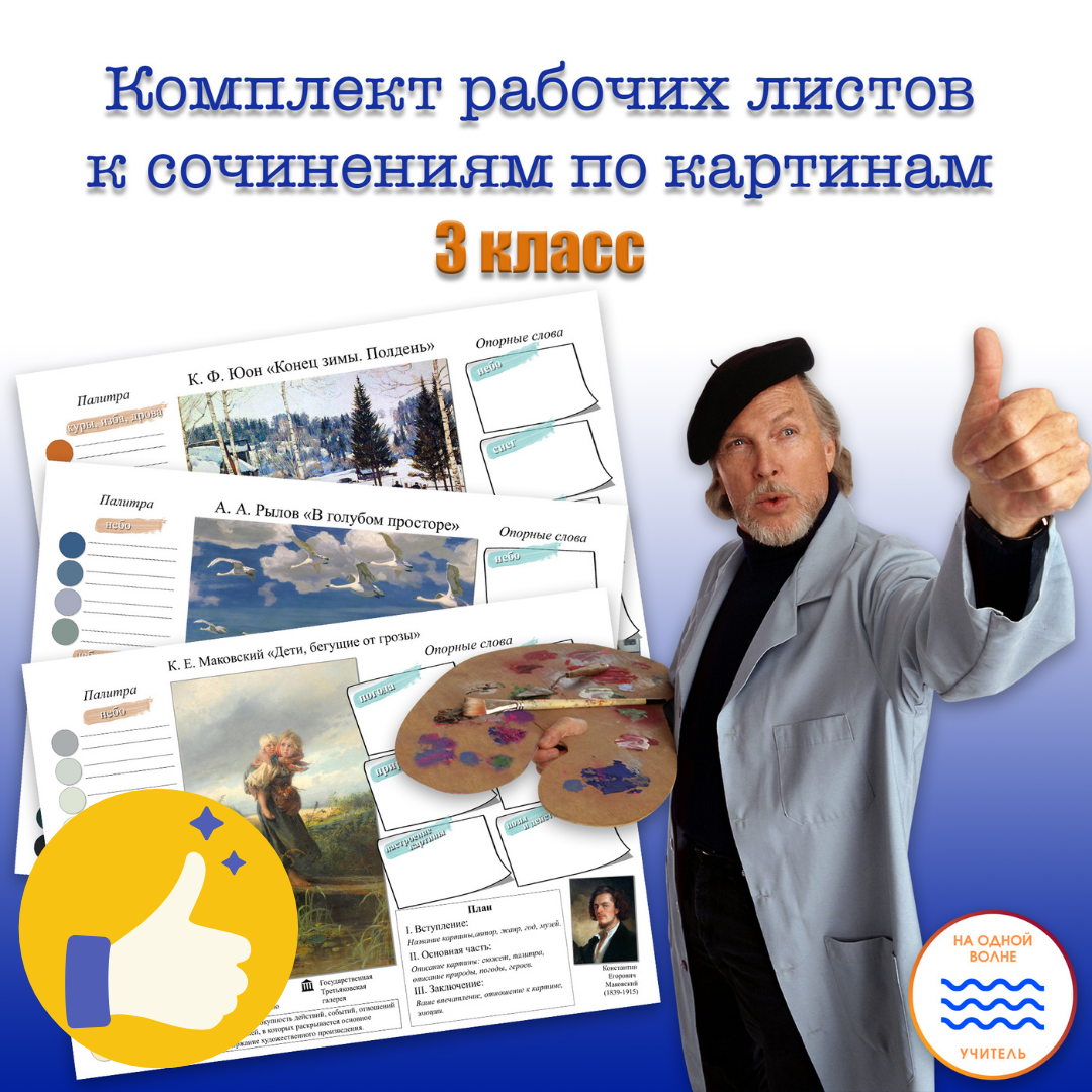 Состав комплекта: 9 готовых рабочих листов по картинам, 9 портретов художников, 9 репродукций, авторское методическое пособие (pdf). Все репродукции по программе УМК "Школа России" (3 класс). Шаблон черновика сочинения. Методичка с интерактивной пошаговой инструкцией по знакомству со структурой рабочего листа и его заполнению.