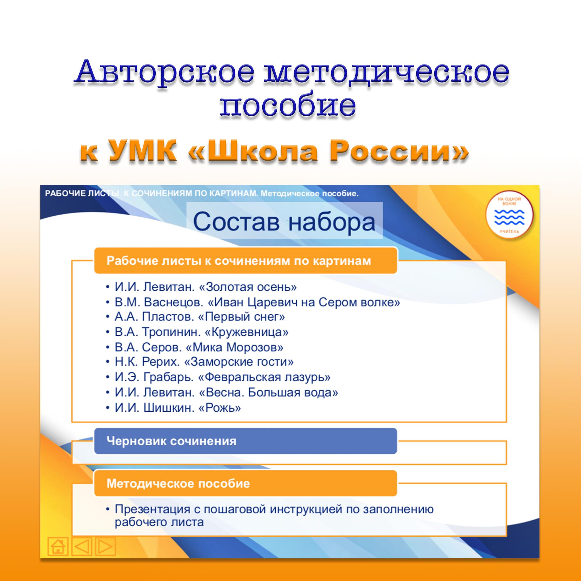 Состав комплекта: 9 готовых рабочих листов по картинам, 8 портретов художников, 9 репродукций, авторское методическое пособие (pdf). Все репродукции по программе УМК "Школа России" (4 класс). Шаблон черновика сочинения. Методичка с интерактивной пошаговой инструкцией по знакомству со структурой рабочего листа и его заполнению.