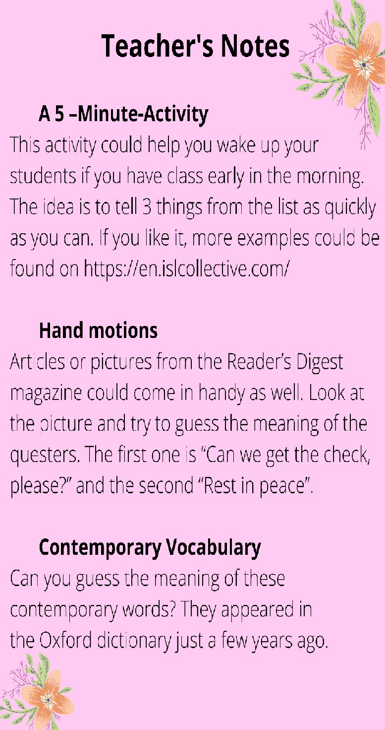 В данном материале вы найдете 10 различных warm up activities. Вы можете их использовать как в начале урока, так и в завершении, если у вас остается несколько минут. Часть из них создана на основе аутентичных печатных и видео материалов. Вы сможете поработать с вокабуляром, слэнгом, акцентам, грамматикой и при этом весело и с пользой провести время.