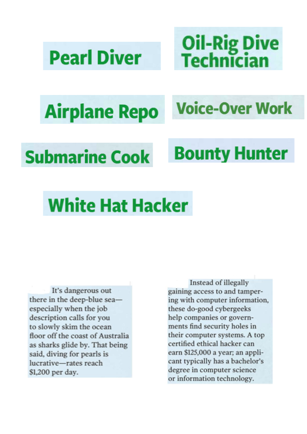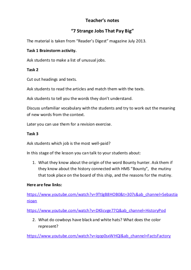 The text was taken from “The Reader’s Digest” magazine hence it is an authentic one. Using this lesson you will be able to check the language proficiency level of your students, and their ability to work with unfamiliar vocabulary in particular. While talking about the origin of the phrases such as a Bounty hunter or a white hat hacker you would have a chance to measure the depth of their general knowledge and probe their predicting, speculating skills. After your students try on and choose the best occupation for themselves, you might have a much clear picture of what to expect from them.