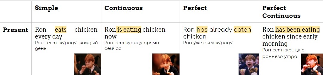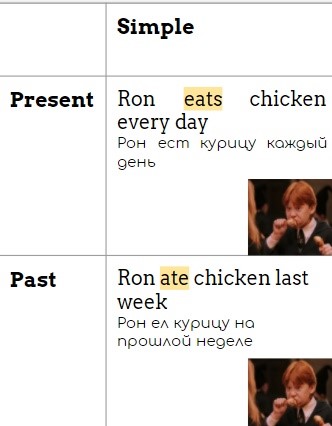 Современный вариант таблицы времен английских глаголов для фанатов Гарри Поттера. Главный герой таблицы - Рон Уизли и его любовь к еде:)