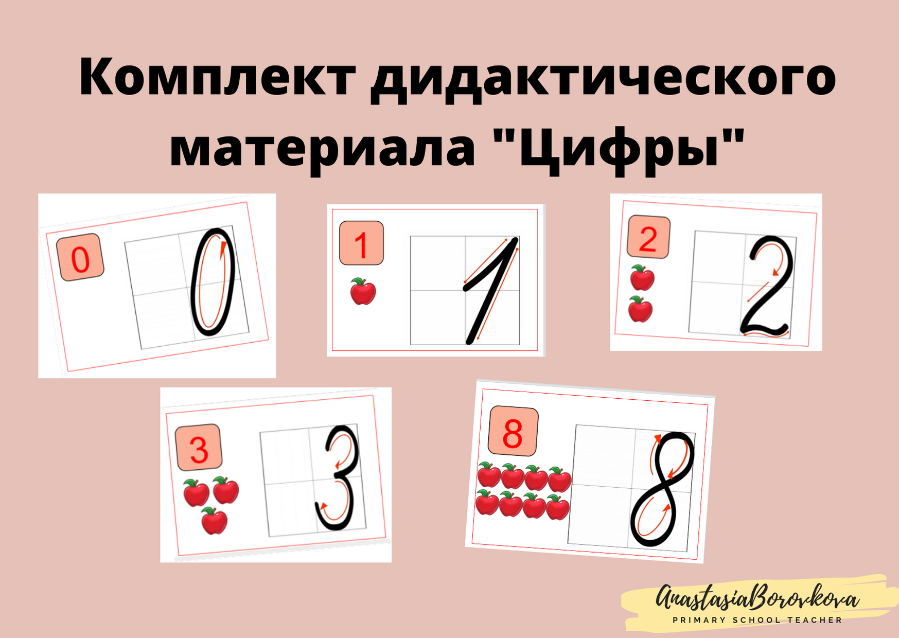 Комплект дидактического материала "Цифры". Комплект состоит из образцов цифр (печатных и письменных). Данное пособие подойдёт для учащихся 1 классов. Размер каждой страницы с цифрой - А4.