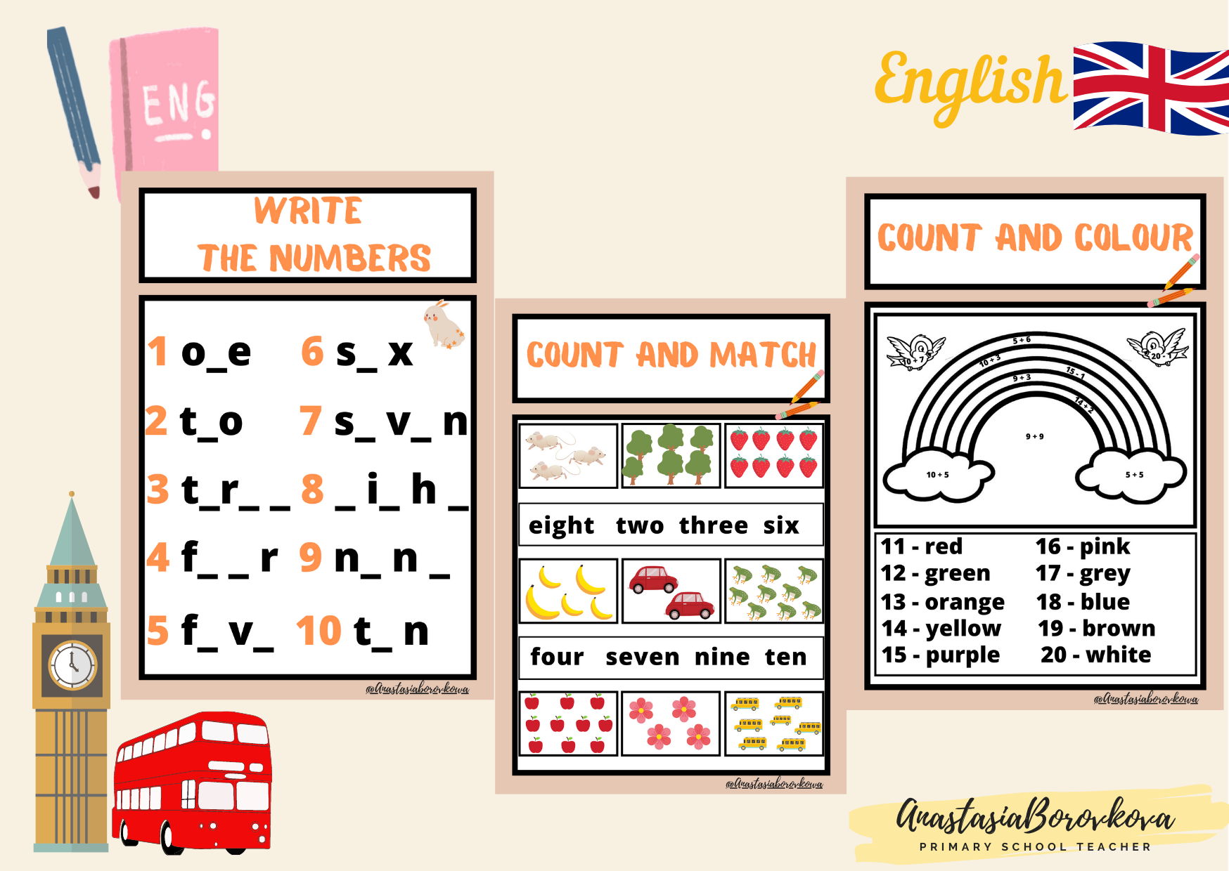 Пособие по английскому языку "Numbers" для дошкольников и учеников начальной школы. Работаем с пособием по принципу: обведи число, посчитай нужное количество предметов и обведи их, а также нарисуй на тарелке или дереве нужное количество предметов. На тарелке можно нарисовать любую еду, а на дереве яблочки. Также в пособии вы найдёте задания: найди и соедини, дополни букву в слове и раскраску.