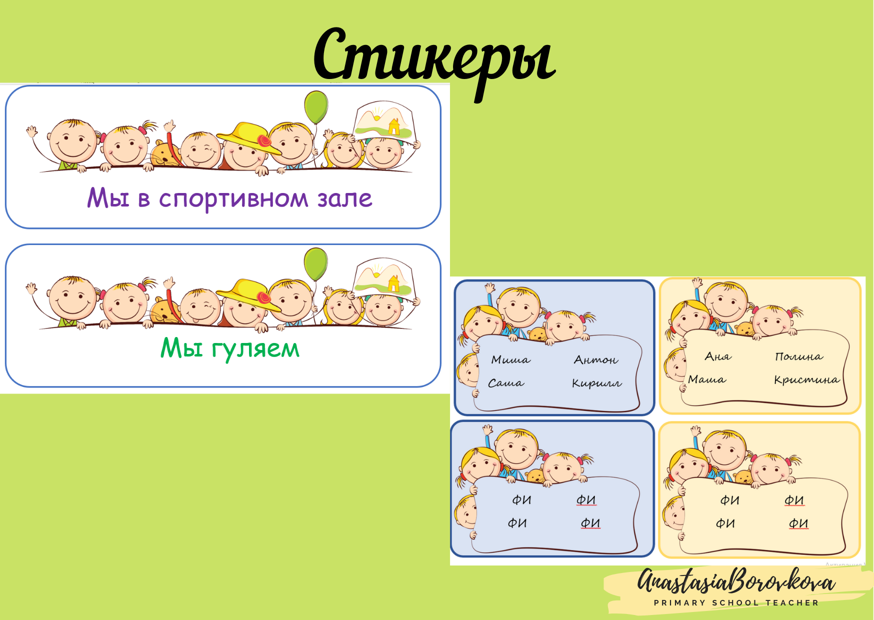 Шаблоны стикеров на детские шкафчики и стикеры на дверь, на случай если класс находится вне учебной комнаты и вышел за её пределы, такими стикерами можно предупредить коллег и родителей, где вас искать.
