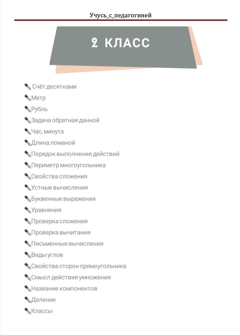 В тетради представлены задания и пояснения к заданиям на следующие темы: Счет десятками, метр, рубль, задача обратная данной, час, минута, длина ломаной, порядок выполнения действий, периметр многоугольника, свойства сложения, устные вычисления, буквенные выражения, уравнения, проверка сложения, проверка вычитания, виды углов, свойства сторон прямоугольника, смысл действия умножения, название компонентов, деление, классы