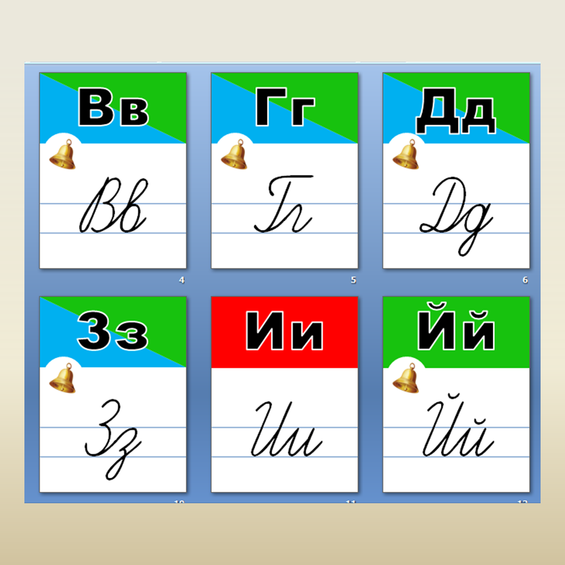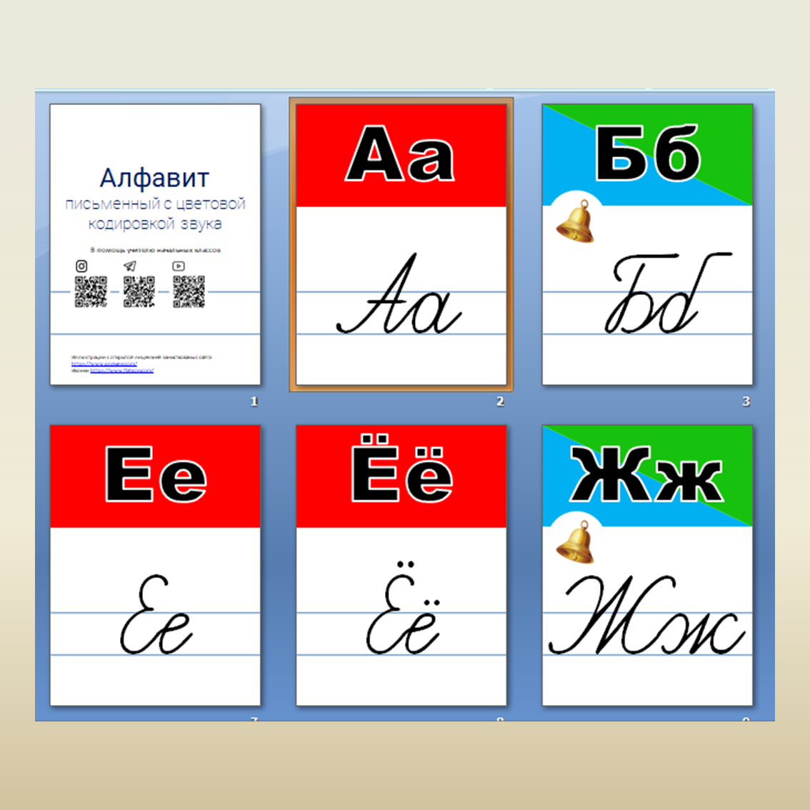 Наглядно-демострационное пособие содержит печатные и письменные варианты букв русского алфавита. В карточках представлены цветовая и предметная кодировка звуков. Материал будет полезен учителям начальных классов и воспитателям классов предшкольной подготовки