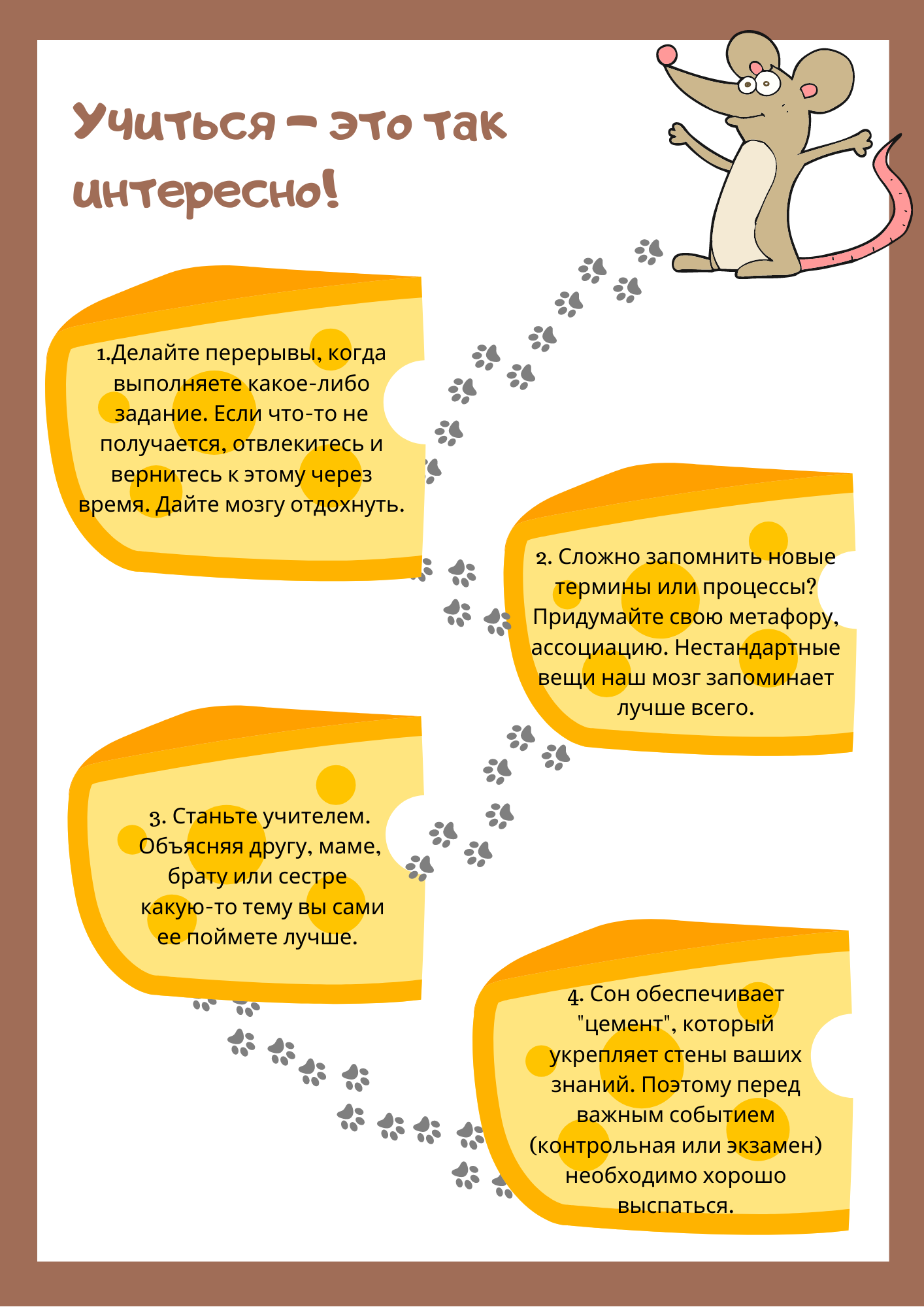 Памятка для учащихся по мотивам книги Барбары Оакли "Уроки на отлично". На дистанте мы столкнусь с тем, что мотивация учащихся упала в разы. Конечно им сложно, и наша задача помочь им научиться учиться. В этой небольшой памятке я выделила 8 основных принципов обучения, которые помогут учащимся скорректировать свою траекторию учения. Также имеются тезисы смысла обучения, которые переходят от "вам приходится учиться" к "вам нужно учиться", тем самым давая понять учащимся отличия обязательств от отсутствия выбора к преимуществам. То есть почему им повезло, потому что у них есть возможность учиться.