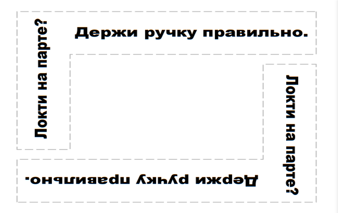 Скачайте, распечатайте, вырежьте и приклейте на парты каждому ученику с помощью прозрачного скотча. Чтобы уголок долго служил, заламинируйте его. Поможет учителю начальных классов научить своих первоклассников правильному положению с наклоном тетради на парте