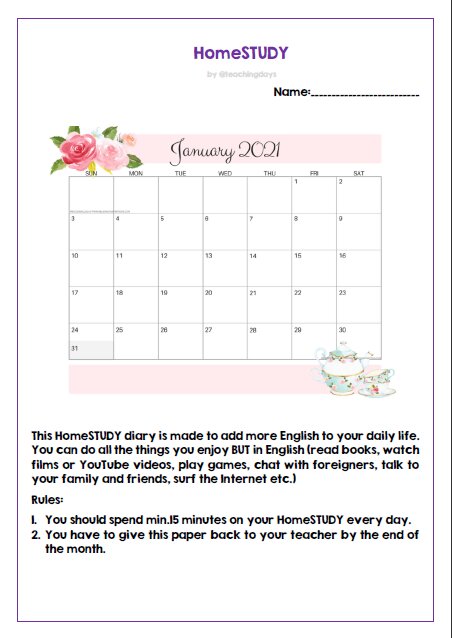 Календарь HomeStudy создан для того, чтобы включить больше английского языка в жизнь учеников. Здесь нет никаких жестких рамок и заданий: ученик делает все, что ему нравится, НО на английском языке. В календарь записывается само действие и сколько по времени оно выполнялось. В конце месяца календарь отдается учителю. Учитель может проанализировать регулярность занятий и интересы ученика.