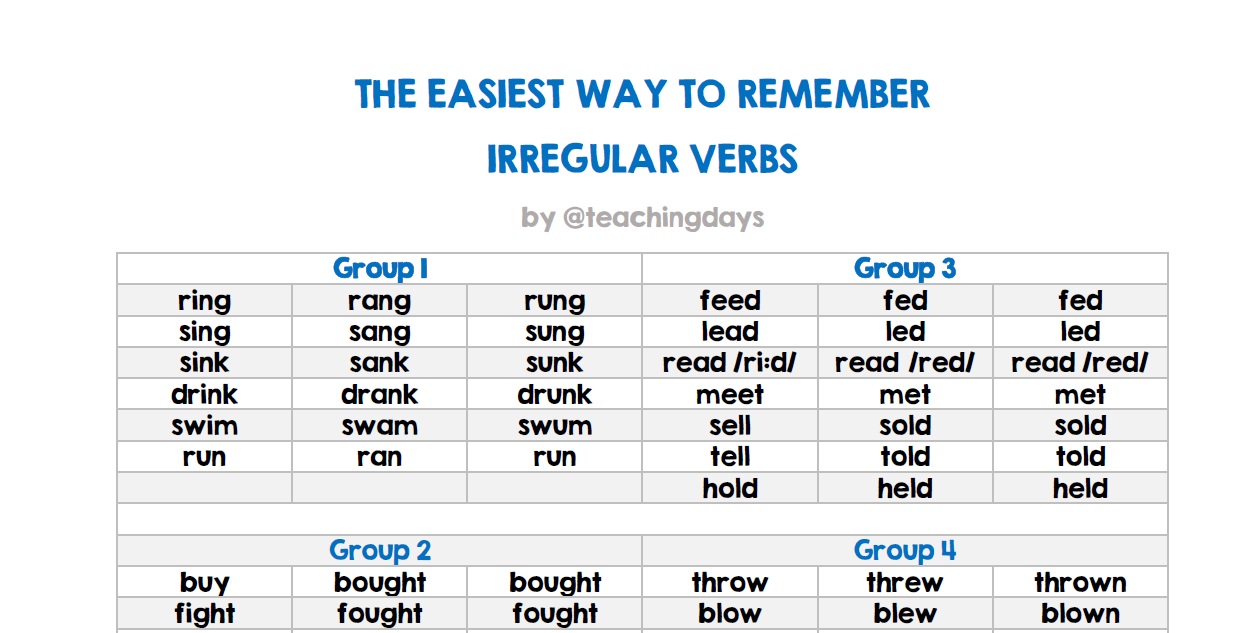 В данной разработке Вы сможете найти список неправильных глаголов, сгруппированных по рифме. Мнемонический способ запоминания поможет Вашим ученикам выучить неправильные глаголы и никогда их не забывать. Преимуществом данного списка является то, что в нем нет тех глаголов, которыми студенты начального и среднего уровня никогда не будут пользоваться.