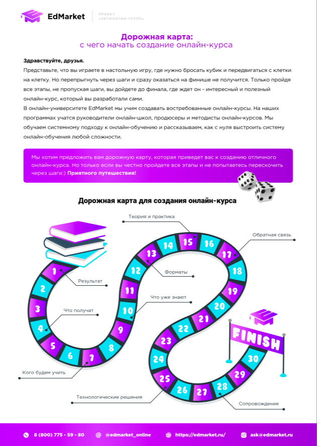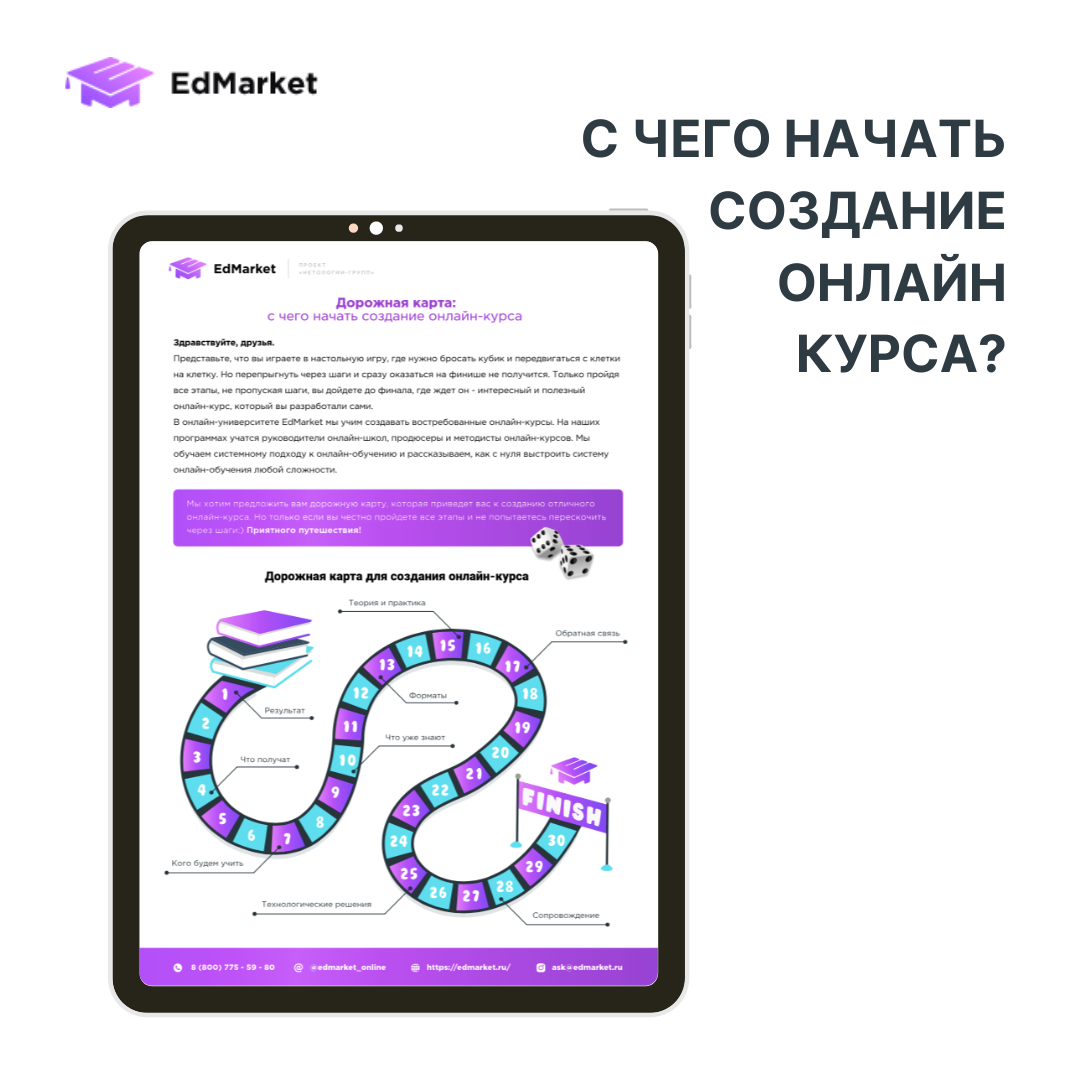 Представьте, что вы играете в настольную игру, где нужно бросать кубик и передвигаться с клетки на клетку. Но перепрыгнуть через шаги и сразу оказаться на финише не получится. Только пройдя все этапы, не пропуская шаги, вы дойдете до финала, где ждет он - интересный и полезный онлайн-курс, который вы разработали сами. В онлайн-университете EdMarket мы учим создавать востребованные онлайн-курсы. На наших программах учатся руководители онлайн-школ, продюсеры и методисты онлайн-курсов. Мы обучаем системному подходу к онлайн-обучению и рассказываем, как с нуля выстроить систему онлайн-обучения любой сложности.