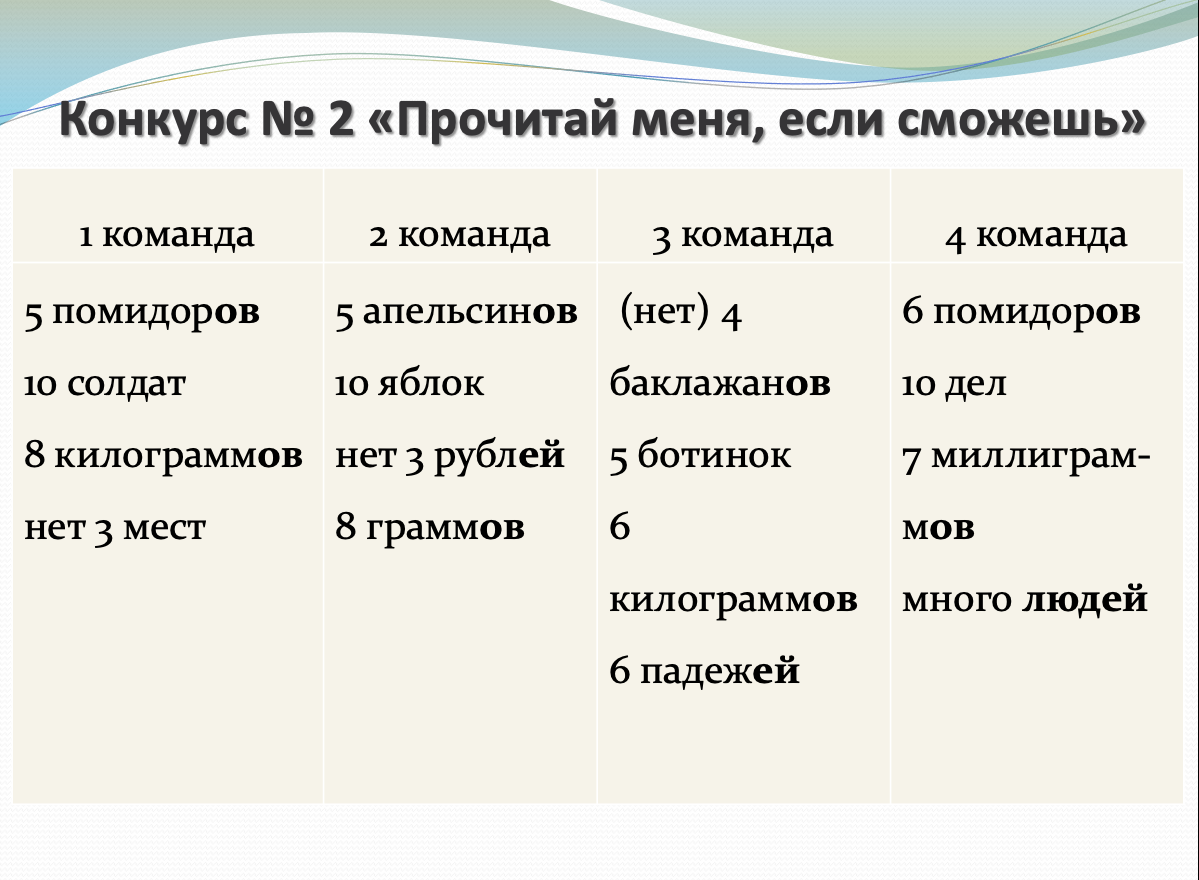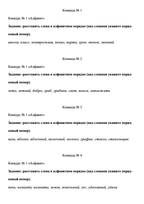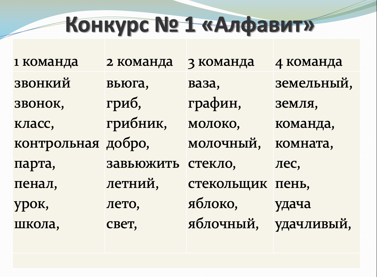 Игра составлена на основе телевизионной передачи «Мы-грамотеи» и представляет командное соревнование. Состав команды – 3 человека. Материал подготовлен для 4 команд: задания 1-3 индивидуальные для каждой команды; задания 4 и 6 – общие. Задание 5 – «домашнее задание» - подразумевает предварительную подготовку, но может быть и экспромтом.Цель: закрепление, обобщение и контроль знаний по графике, орфоэпии, синтаксису, словообразованию, лексике, орфографии русского языка; подготовка к ВПР.