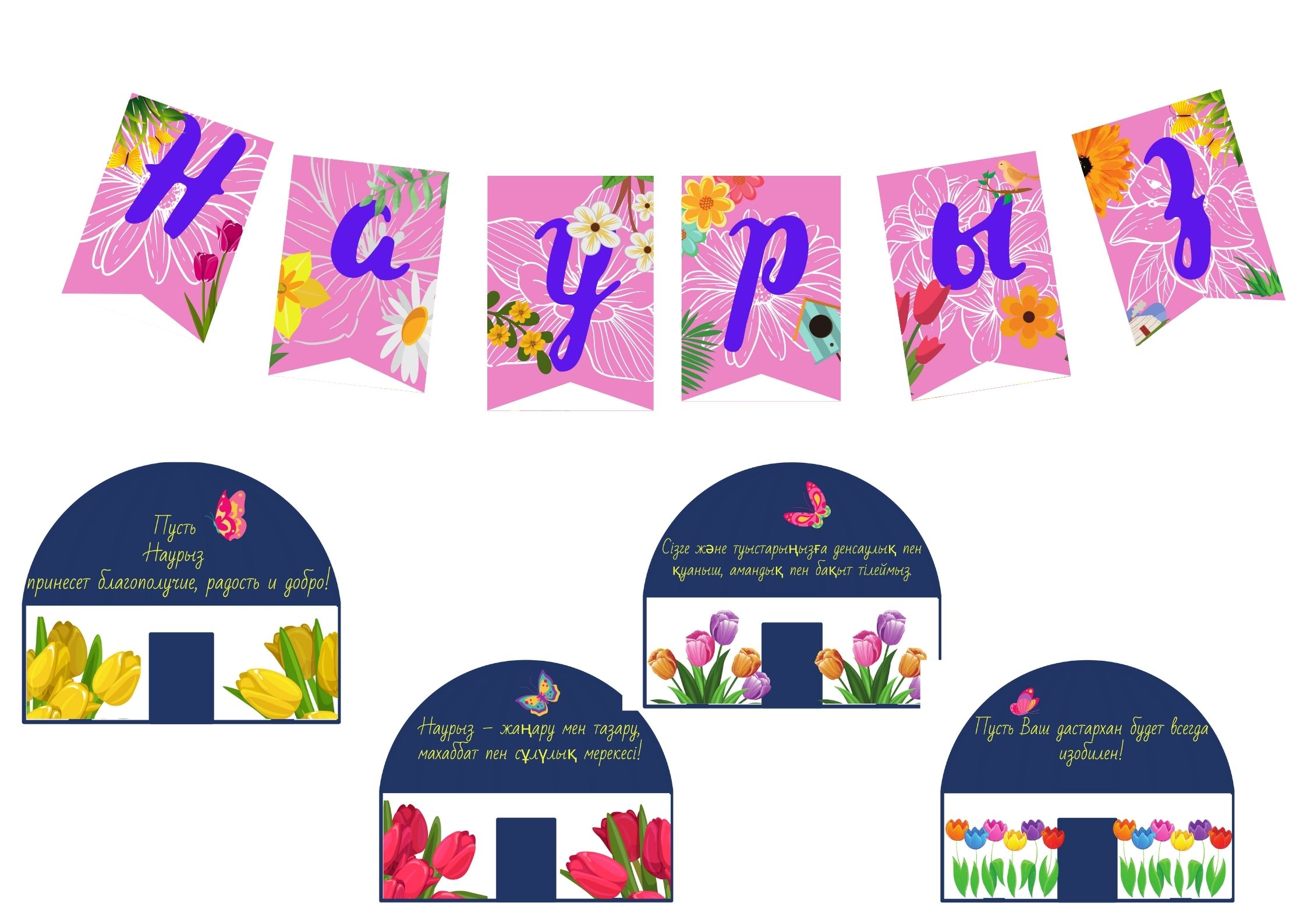Оформление в виде флажков-надписи "Наурыз" и юрт с поздравлениями на русском и казахском языках. Может использоваться в качестве украшения кабинета или классной доски к Наурызу.