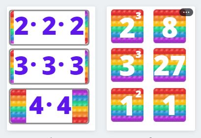 Условия игры: дети должны соединить произведение множителей с квадратом или кубом числа и найти правильное решение.