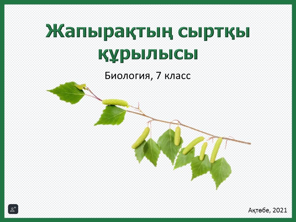 «Жапырақтың сыртқы құрылысы мен қызметі» тақырыбында өсімдік жапырақтарының түрлері, жапырақ алақандарының пішіндері мен жапырақ жүйкелері туралы ақпарат алуға негізделген.