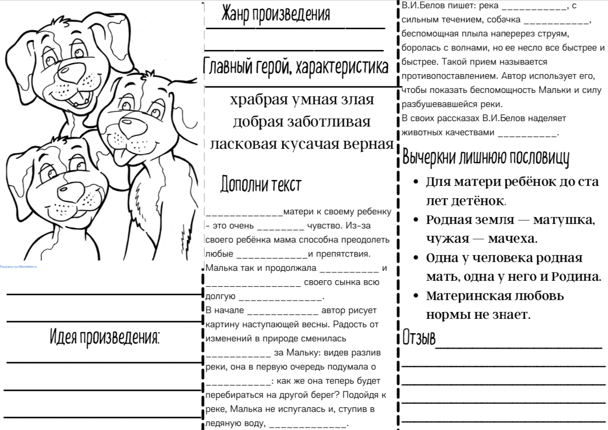 Рабочий лист "Малька с заданиями: Идеи произведения, жанр произведения, дополни текст, вычеркни лишнюю пословицу