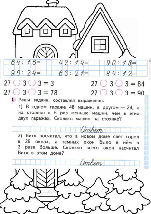 Рабочий лист по математике с 3 заданиями "Зимний домик с елками": деление и две задачи