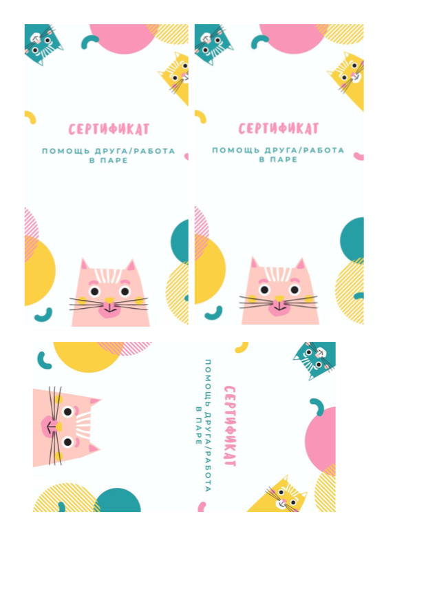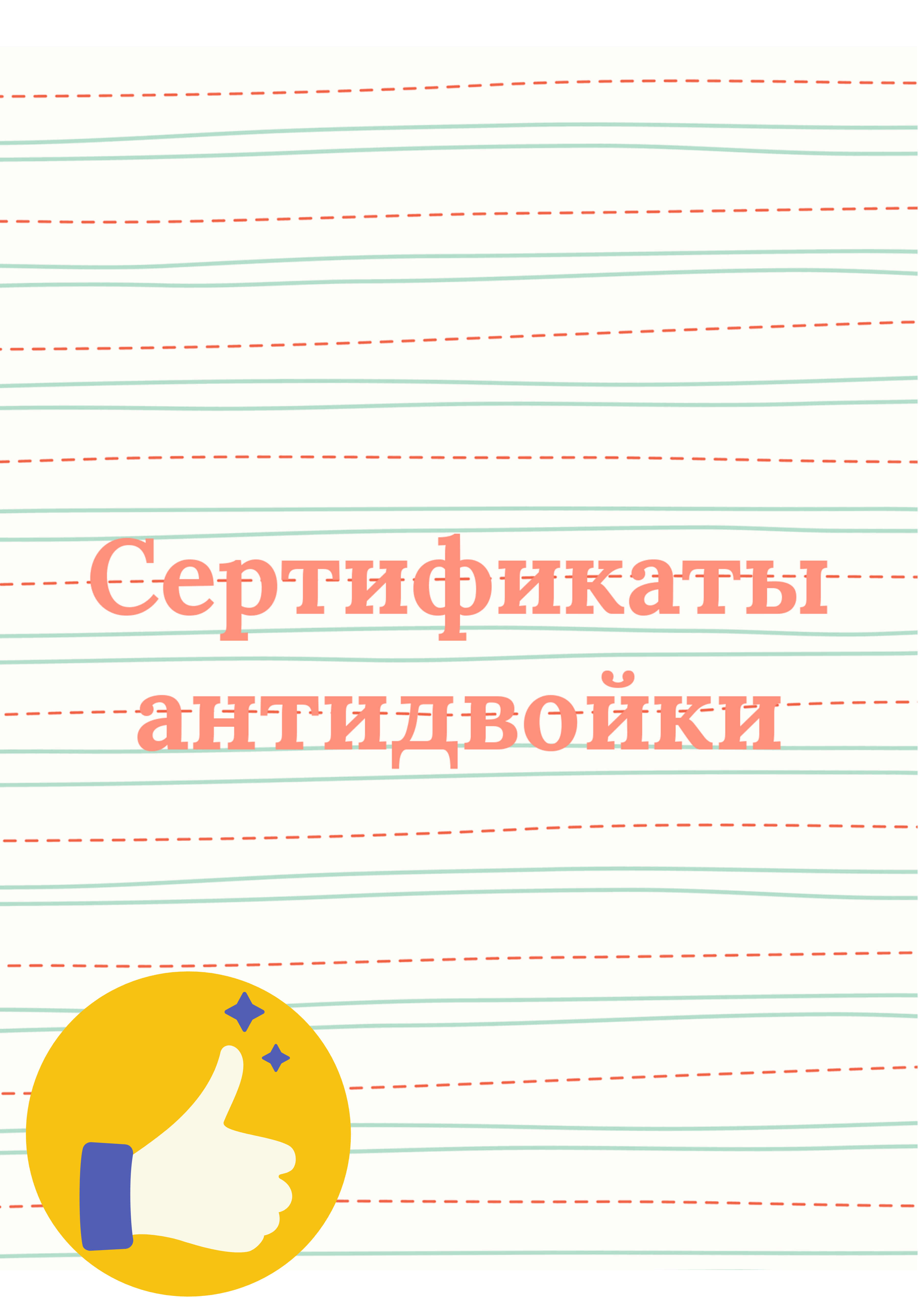 Различные сертификаты-антидвойки: 1) Сертификат помощь друга/работа в паре; 2) Сертификат освобождение от домашнего задания; 3) Сертификат помощь учителя на контрольной; 4) Сертификат увеличения оценки на 1 балл; 5) Сертификат не выставления оценки в журнал; 6) Сертификат освобождение от домашнего задания.