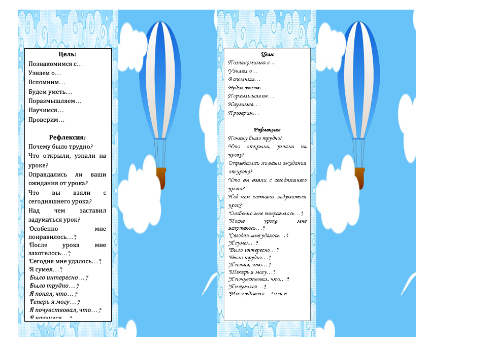 Закладки Цели и Рефлексия. Напоминание для саморефлексии учеников и учителей (с возможностью редактировать документ). Формат: docx