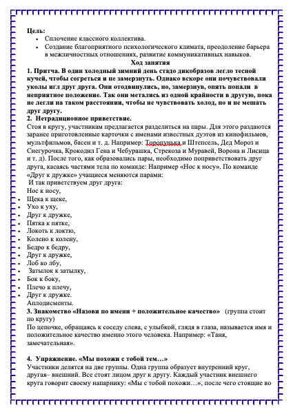 • Создание благоприятного психологического климата, преодоление барьера в межличностных отношениях, развитие коммуникативных навыков.