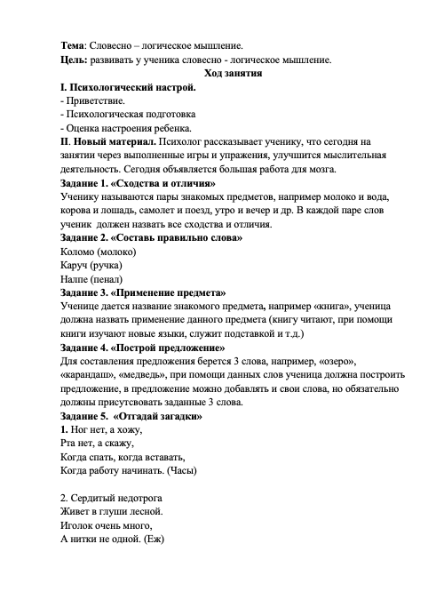 Психологическое занятия: Словесно – логическое мышление