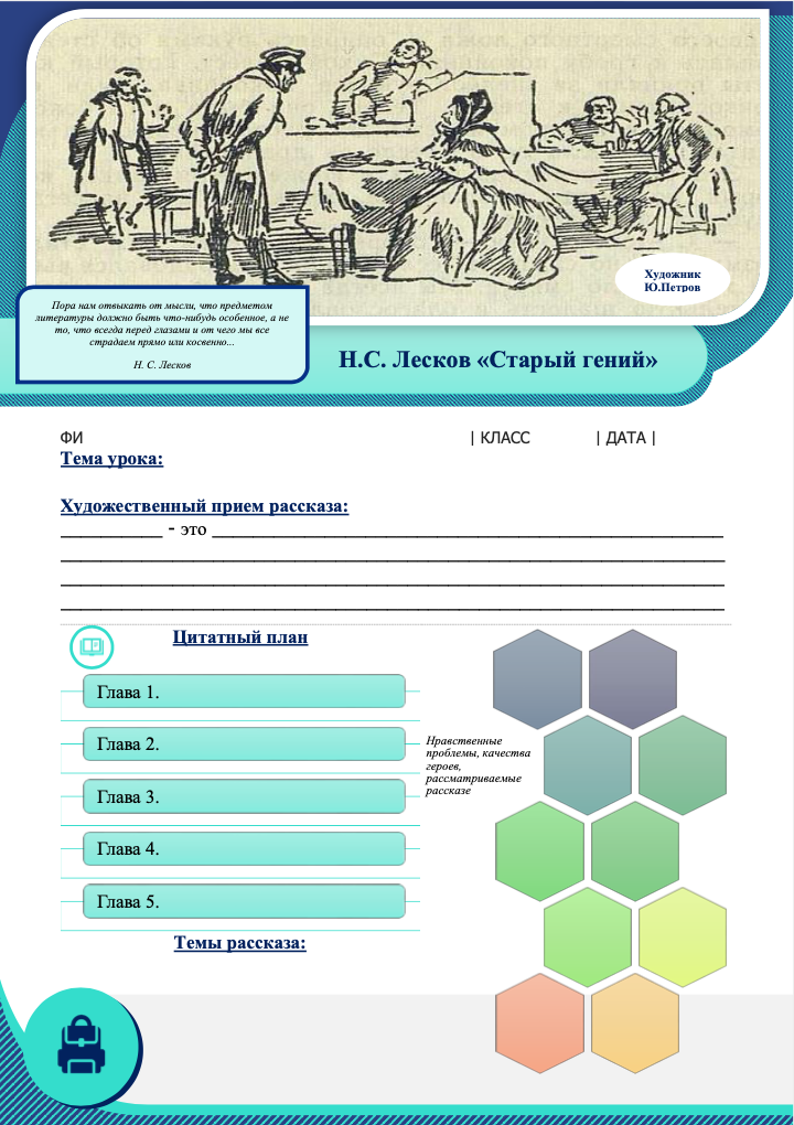 Рабочие листы с заданиями по произведению Н.С. Лескова - «Старый гений»: художественный прием, тема произведения, цитатный план, проблемы, главная мысль и другие задания
