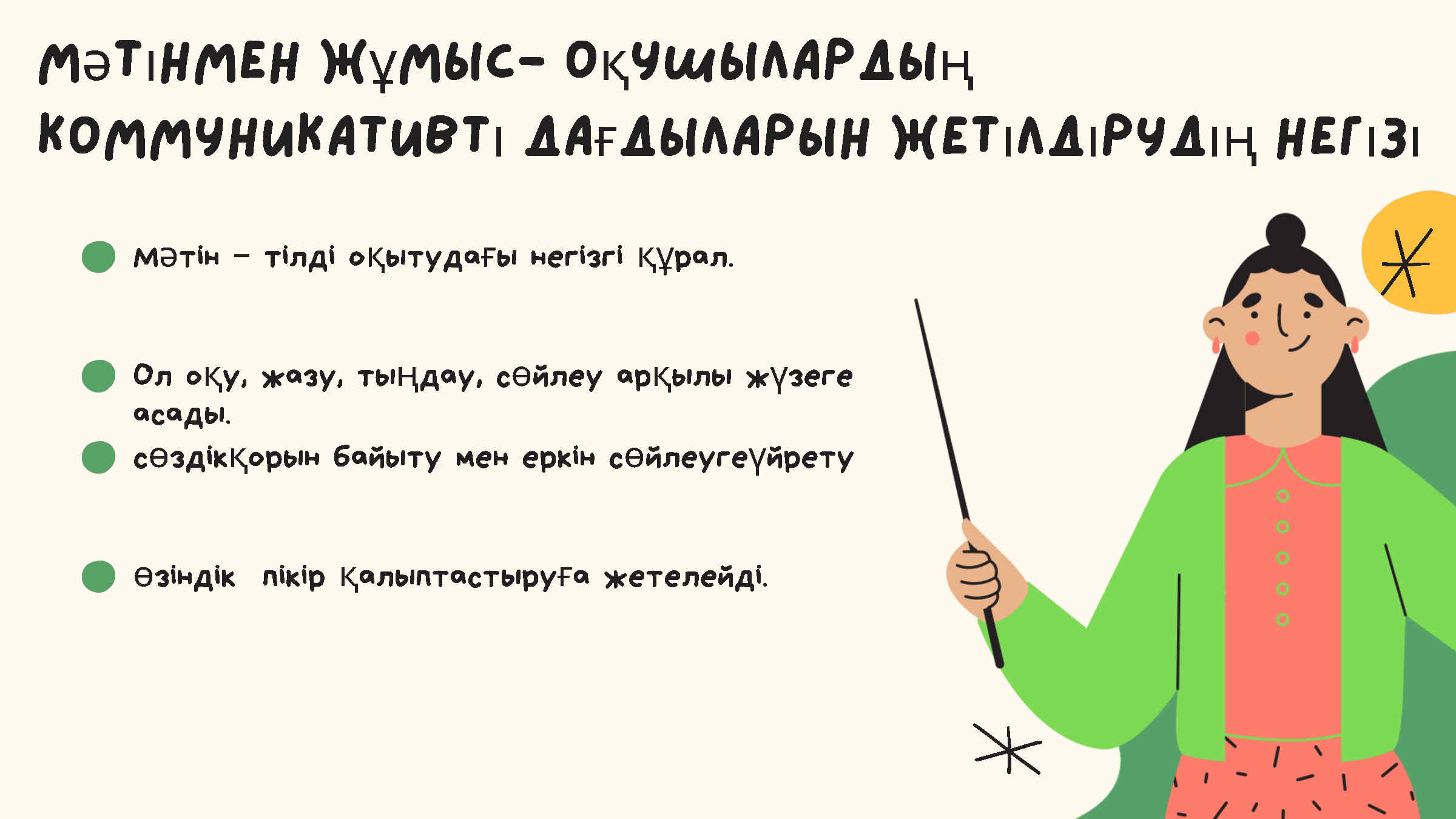 әдістемелік әзірлеме мәтінмен жұмысқа арналған,әзірлемеде мәтінмен жұмыстың амалдары мен тәсілдері талқыланған.