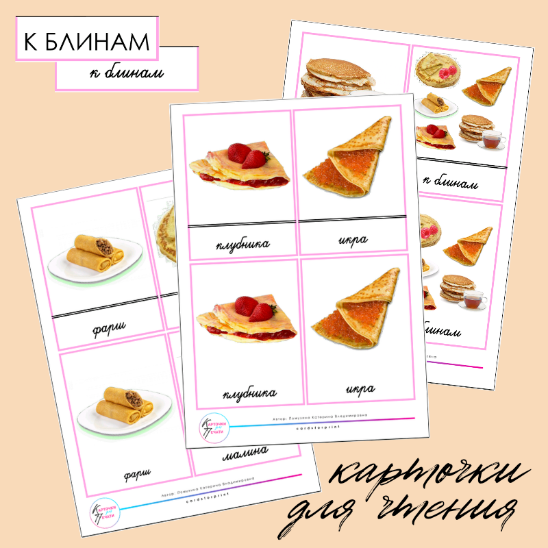 Блины - карточки для чтения в 2 шрифтах