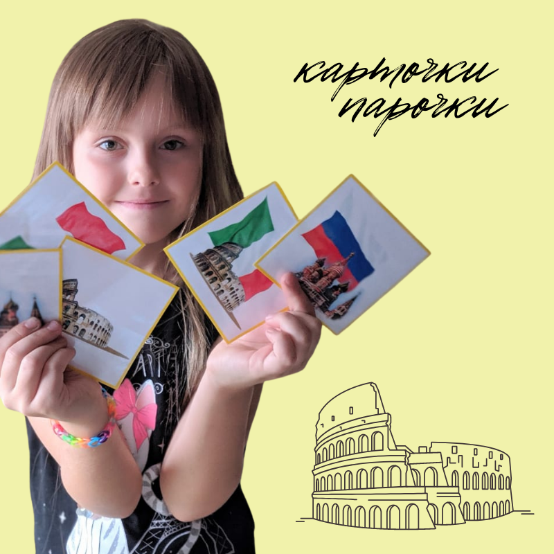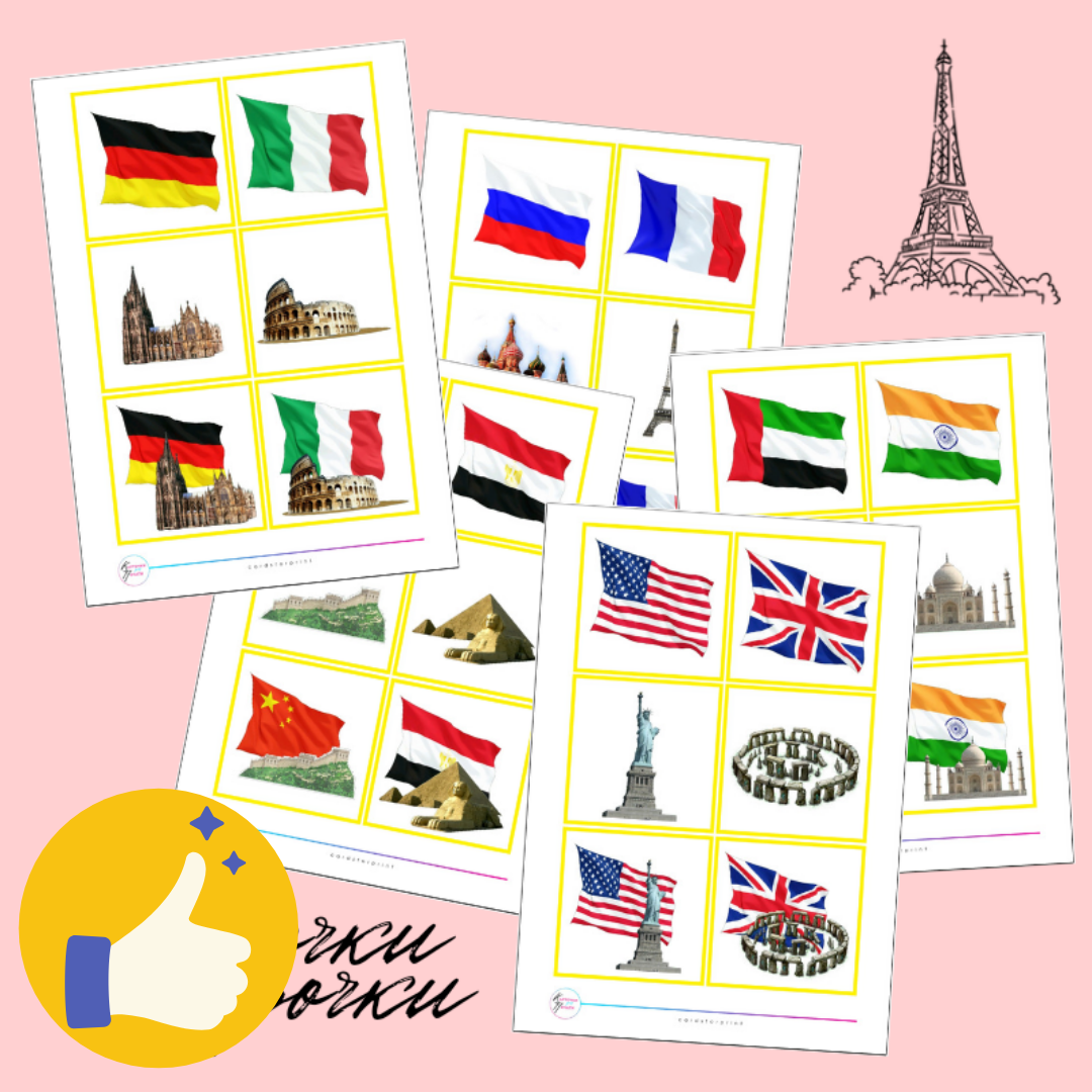 Проверочные карты нужны для самоконтроля ошибок. На этих карточках изображены оба предмета одной пары (сооружение и флаг). Эти карточки используются в конце работы для проверки правильности составления пар!