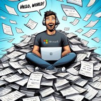 Рисунок человека, сидящего в огромной стопке бумаг, на каждой из которых написано "Hello, World!", с надписью: "Когда ты начинаешь изучать